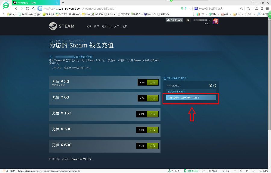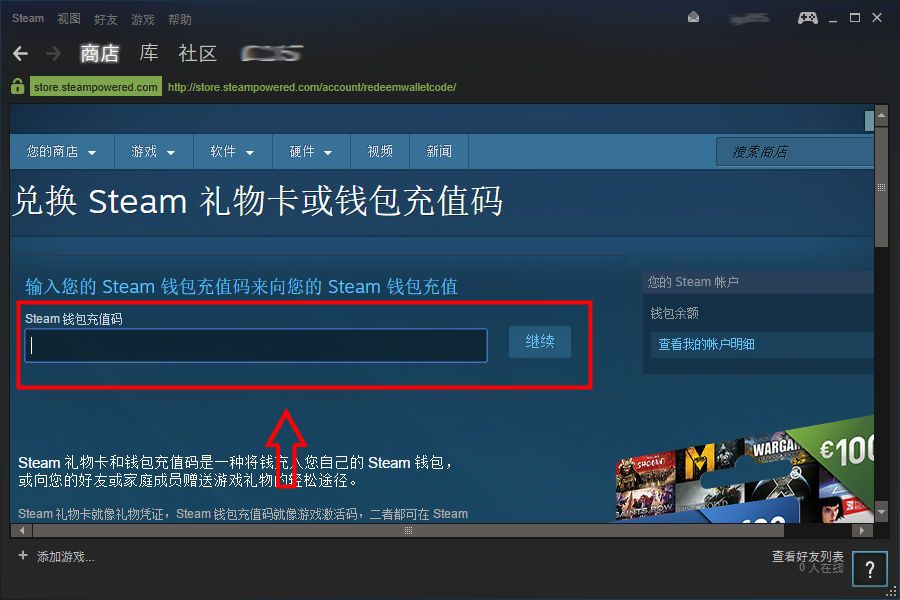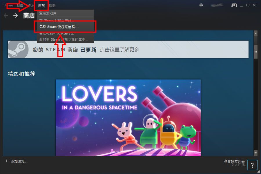 一、登录Steam客户端,点击左上方游戏-兑换Steam钱包充值码