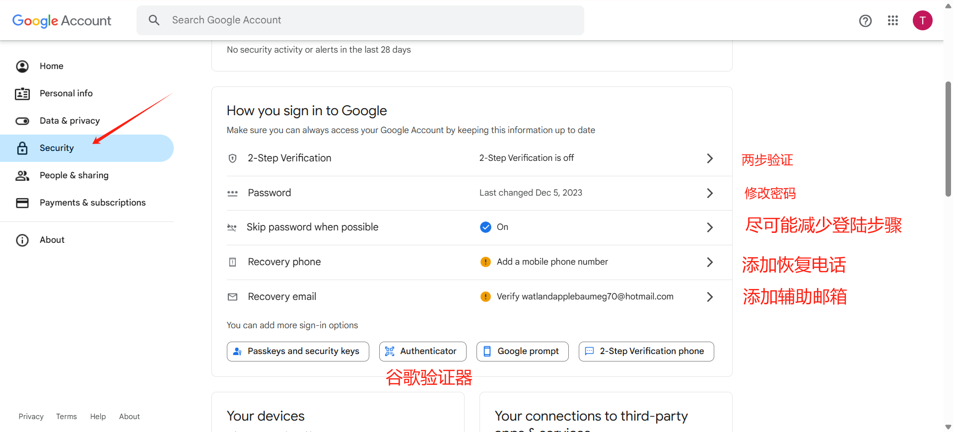 2、进入安全设置即可添加辅助邮箱、恢复电话号码(也称辅助电话号码)、谷歌验证器(也称2FA 验证),并开启两步验证;