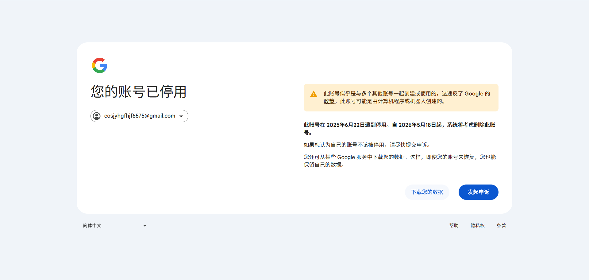 方法:别担心,请发起“申诉”,按照提示步骤完成申诉即可,注意:最后一步需要填入你真实的邮箱,谷歌会告诉你何时可以登陆,如果你在收到邮件后一天内未登陆,可能申诉失效,需要重新申诉!