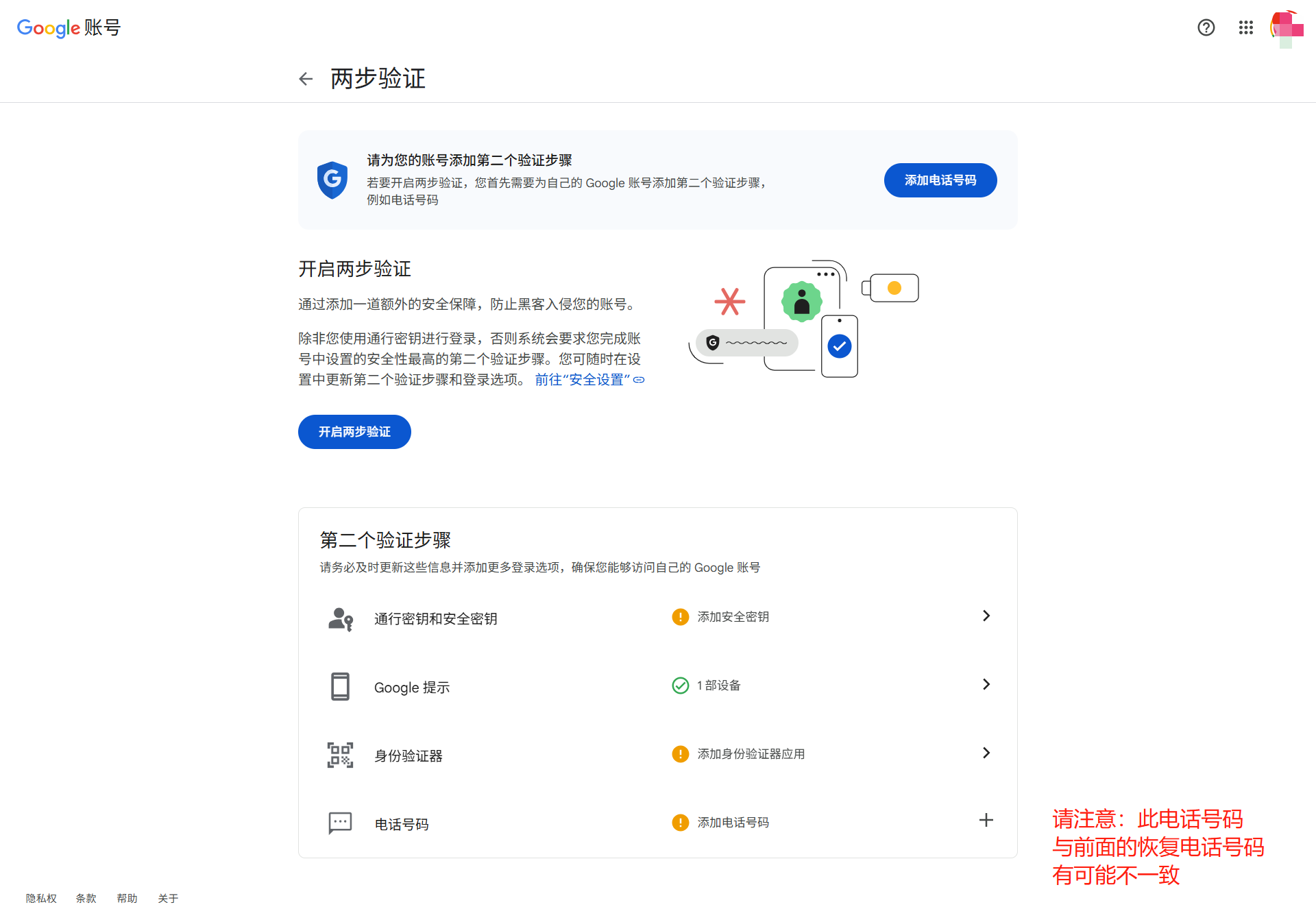 3、关于两步验证:你只需开启两步验证即可,但请注意两步验证的电话号码与恢复电话号码是可以不同的,但请注意你需要能够收到验证码短信的电话号码才行。