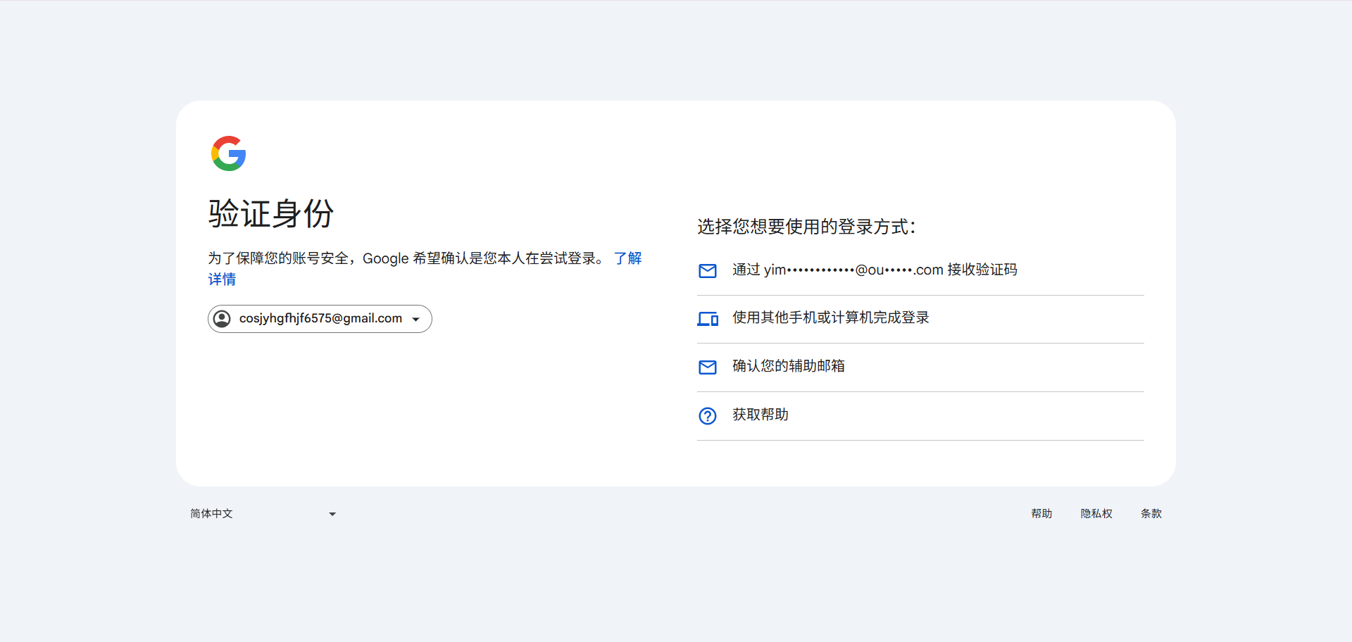 方法一(推荐:此为最快的验证方式):确认您的辅助邮箱,直接输入该账号的辅助邮箱即可。通过“确认您的辅助邮箱”方式直接输入辅助邮箱即可实现登陆,但是为了防止后期封禁账号,请参考本文第二部分《二、使用建议》添加真实的辅助邮箱。