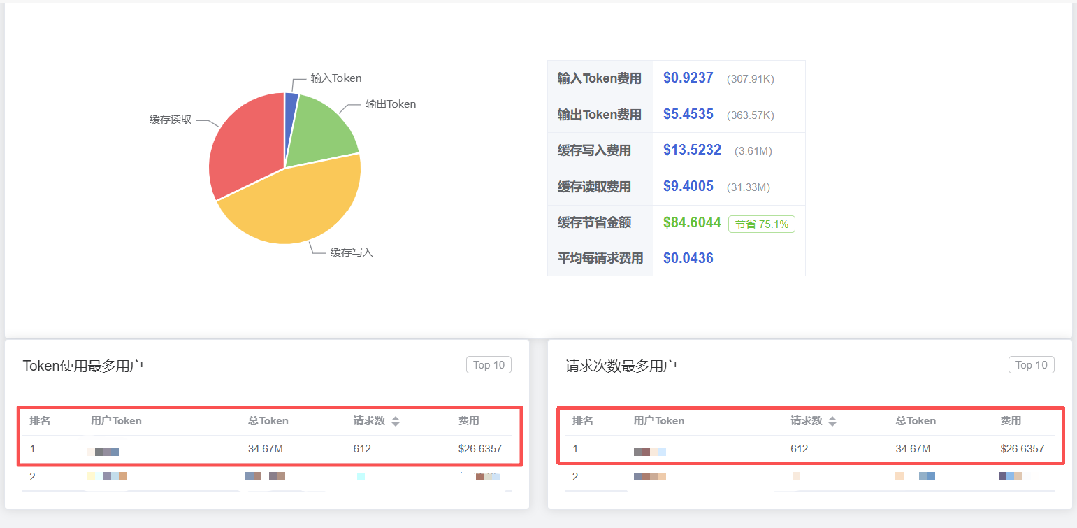 - 图2:令牌消耗分布(饼图与表格)。总令牌消耗约86,604(75.1%占比),主要用于中文令牌($13,522,31.3%)。Top 10用户中,admin账号主导消耗(34.67M令牌,$26.6357),其次为ericsun(9.41M令牌,$1.343)。