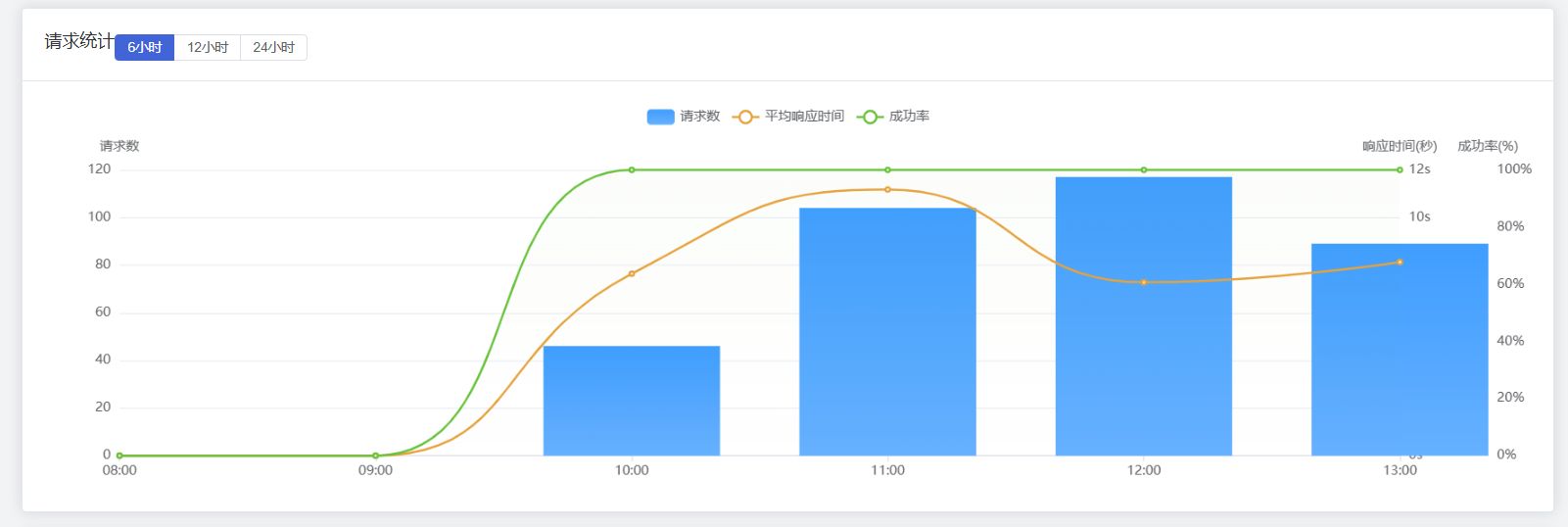 - 图1:流量与响应时间趋势(时间序列图,08:00-13:00)。该图显示了请求流量(蓝色柱状)和响应时间(绿色曲线、橙色曲线)的动态变化。从10:00起,流量峰值出现在11:00-12:00,响应时间稳定在10秒以内,体现了Sonnet模型的效率。下午限制后,曲线趋于平稳。