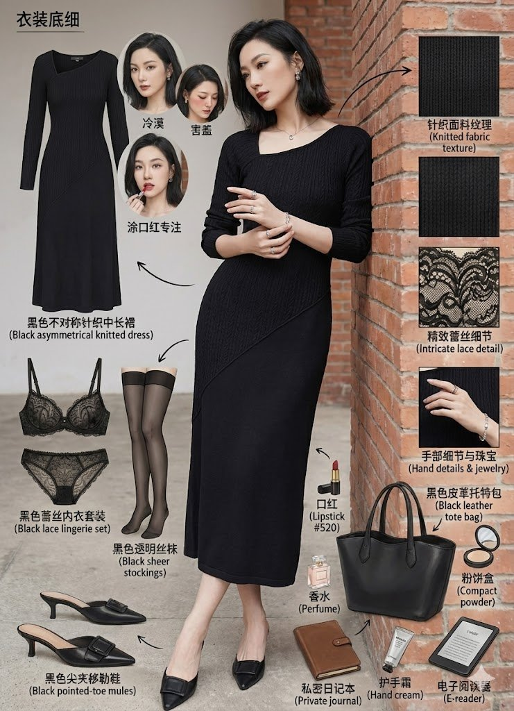- 生活物件:黑皮托特包(散落唇膏、香水、私人日记本)、手霜、E-reader。黑纱不对称针织裙角色分解图风格笔记:羊皮纸纹理背景,注释如“磨砂皮革手感”,像在窥探她的私人世界。